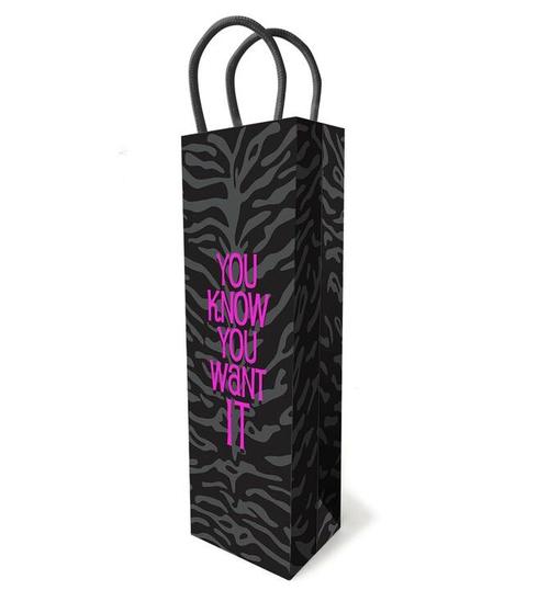 Unlike other gift bags, you’ll be proud to wrap your naughty gifts in these playfully suggestive bags. They look expensive and feel amazing! High quality, unique luxury gift bags made of thick, sturdy cardstock paper with elegant woven handles. A standard wine-size gift bag with black-on-black velvet-like flocked tiger pattern is imprinted with a magenta foil stamp that calls out “You Know You Want It!”. This delightful bag is the perfect size for gifting a vibrator and is as fun to give as it is to receive.