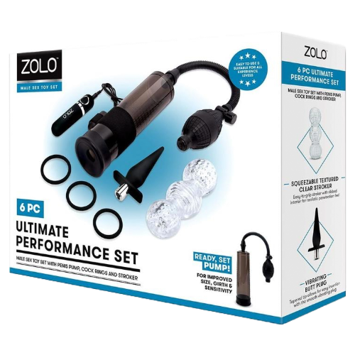 he 6 Piece Ultimate Performance Set from ZOLO contains all of the essentials for an unforgettable experience. Start with the penis pump that has an attached vibrating bullet for improved size, girth and sensitivity. Next comes a clear handheld stroker with a stimulating ribbed interior for a realistic penetration feel, and a vibrating butt plug with a tapered tip. Three cock rings of varying sizes round out this set, which is easy to use and suitable for all experience levels.