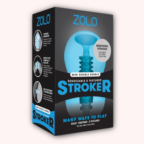 The ZOLO Blue Mini Double Bubble Squeezable & Textured Stroker is a versatile mini male stroker perfect for solo play or foreplay with a partner. Slide into the smooth or textured side of the sleeve and enjoy the intense sensations. Use it during oral sex for added pleasure. Or add excitement to intercourse by wearing it as a bumper to stop penetrating fully. Includes renewing powder to help keep your stroker dry, clean and always ready for action!