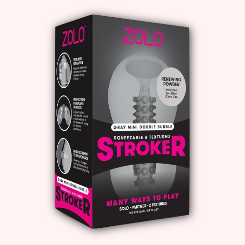 The ZOLO Grey Mini Double Bubble Squeezable & Textured Stroker is a versatile mini male stroker perfect for solo play or foreplay with a partner. Slide into the smooth or textured side of the sleeve and enjoy the intense sensations. Use it during oral sex for added pleasure. Or add excitement to intercourse by wearing it as a bumper to stop penetrating fully. Includes renewing powder to help keep your stroker dry, clean and always ready for action!